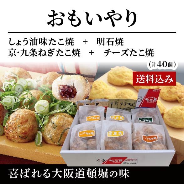好評を頂いている特別セット『あじわい』『おもいやり』と、たこ焼や、お好み焼の大阪名物を詰め合わせた『おこたこセット』、6個ずつ小分けの箱に入っていてそのままレンジであたためられる便利な『しょう油たこ焼ボリュームセット』もございます。